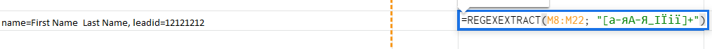 Używamy do tego formuły. Aby znaleźć Imię_Nazwisko w tekście, do pomocy przychodzi nam formuła dla pracy z wyrażeniami regularnymi: .=REGEXEXTRACT(M3; “[a-żA-Ż_ĄĆĘŁŃÓŚŹŻąćęłńóśźż]+”). W jej pierwszej części wskazujemy, gdzie szukać – komórka z danymi (M3), a w drugiej – warunki do poszukiwania [a-żA-Ż_ĄĆĘŁŃÓŚŹŻąćęłńóśźż]+ . W ten sposób jesteśmy w stanie odnaleźć wszystkie litery alfabetu ukraińskiego i rosyjskiego (w formie małych i wielkich liter), a także znaki specjalne, które są używane do podziału.