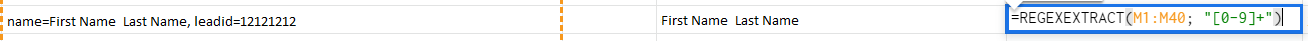 Potrzebujemy zrobić to też dla ID leadu naszego klienta. Formuła będzie wyglądać tak: =REGEXEXTRACT(M3; “[0-9]+”) lub =REGEXEXTRACT(M3; “leadid=[0-9]+”). Podobnie określamy komórkę i parametry wyszukiwania – wszystkie cyfry i, jeśli to konieczne, znaki specjalne, które zawiera Twój identyfikator leadu. Na wyjściu otrzymujemy oddzielną kolumnę z potrzebnymi informacjami (nie zapomnijmy, że formułę należy rozciągnąć na cały zakres).