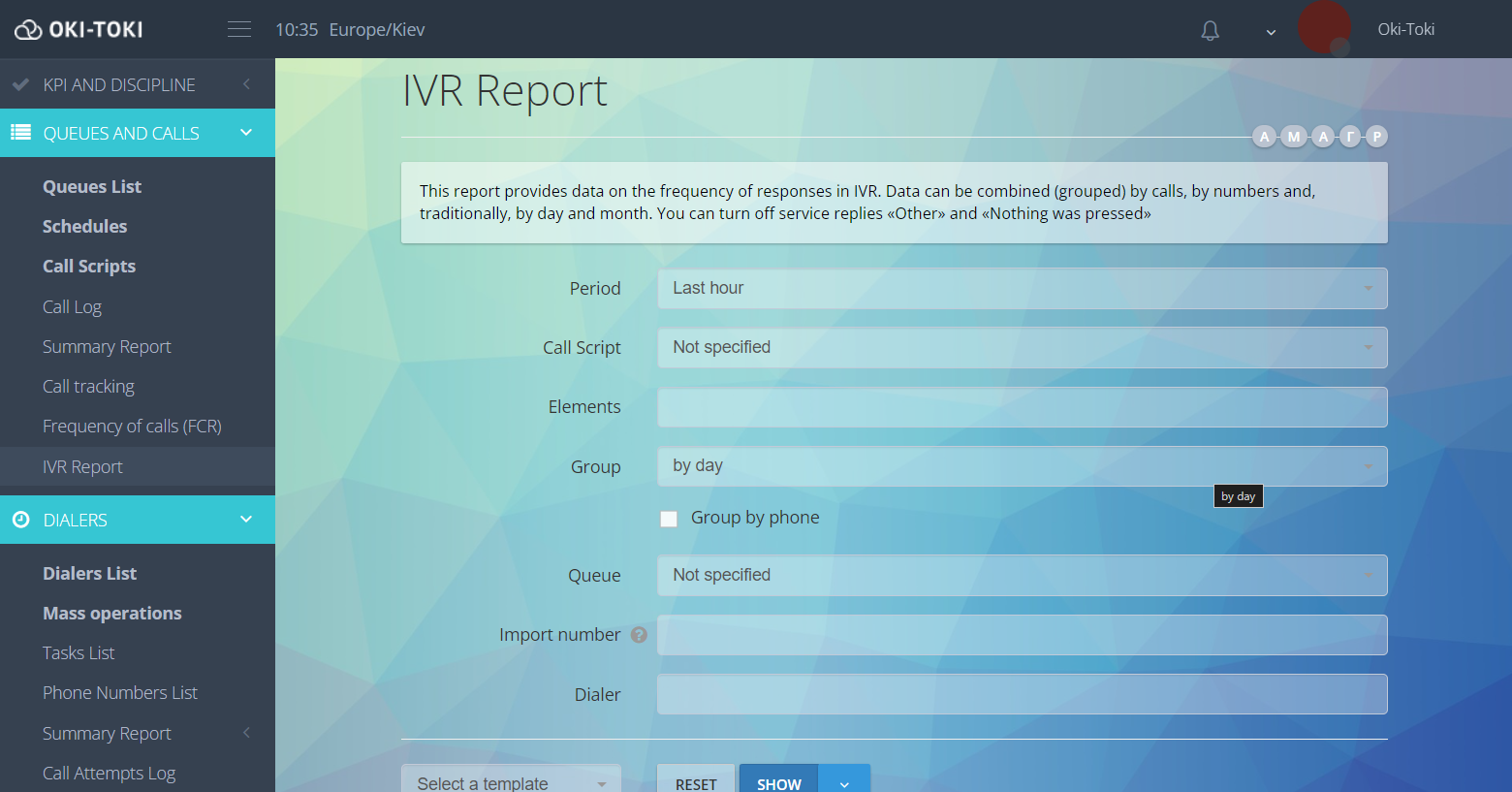 - Aby sprawdzić wyniki naciśnięć, należy wejść do sekcji “Kolejki i połączenia telefoniczne”, wybrać “Raport z IVR”;