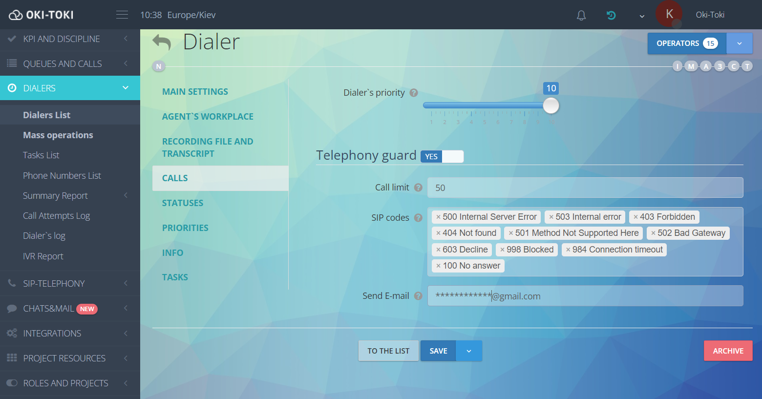 - Możliwe jest aktywowanie automatycznego wyłączania w przypadku awarii telefonii. Jeśli połączenia zaczynają zostawać przerwane błędem telefonii (z listy) jeden po drugim, autodialer zatrzyma się automatycznie.