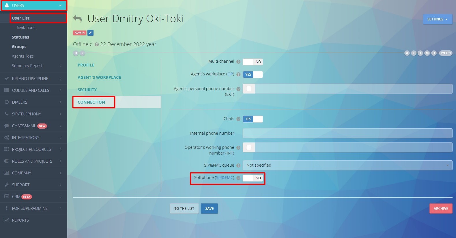 - W profilu użytkownika w sekcji “Komunikacja” włącz opcję “Softfon“(pozwala na odbieranie połączeń na tym urządzeniu);