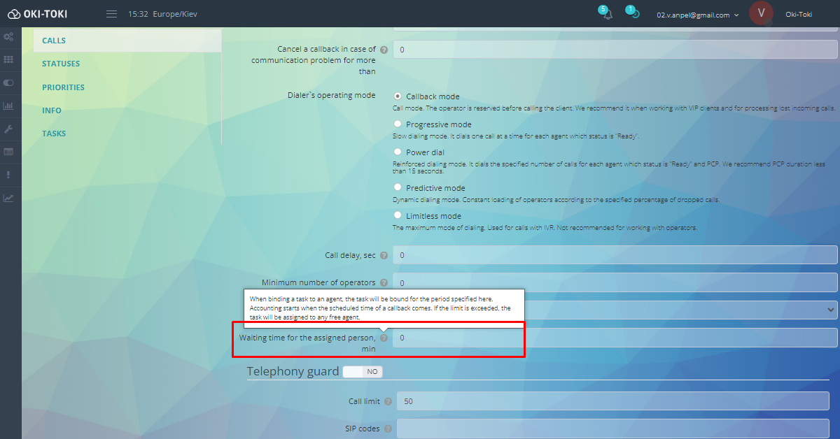 Podaj tryb dzwonienia “Callback mode” i czas oczekiwania odpowiedzialnego. Z chwilą nadejścia czasu, kiedy zadanie jest zaplanowane do oddzwonienia, zaczyna się odliczanie czasu. Gdy czas oczekiwania odpowiedzialnego upłynie, zadanie jest zwalniane od odpowiedzialnego i przechodzi do pierwszego wolnego operatora.