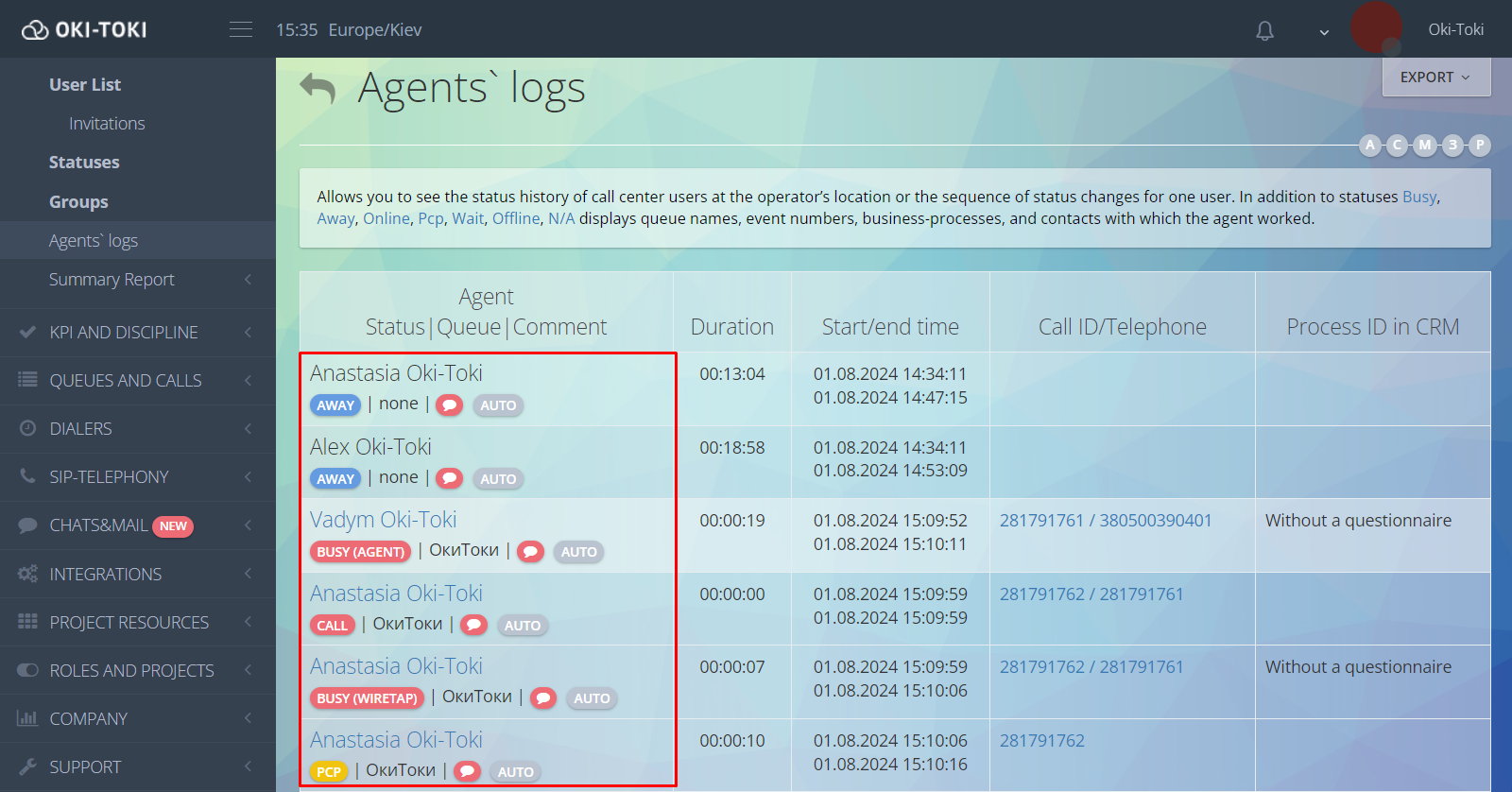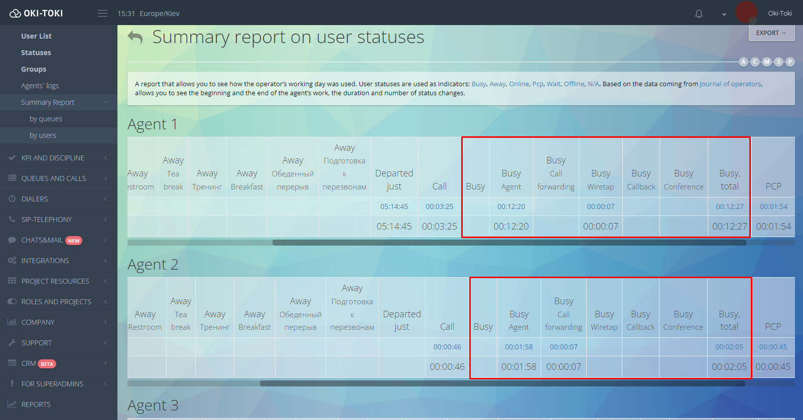 Dla zestawienia wg statusów umieściliśmy statusy obciążenia operatora w oddzielnych kolumnach – tak będzie łatwiej analizować szczegóły. Ten wygląd jest aktywny przy aktywnym filtrze “Szczegółowo”