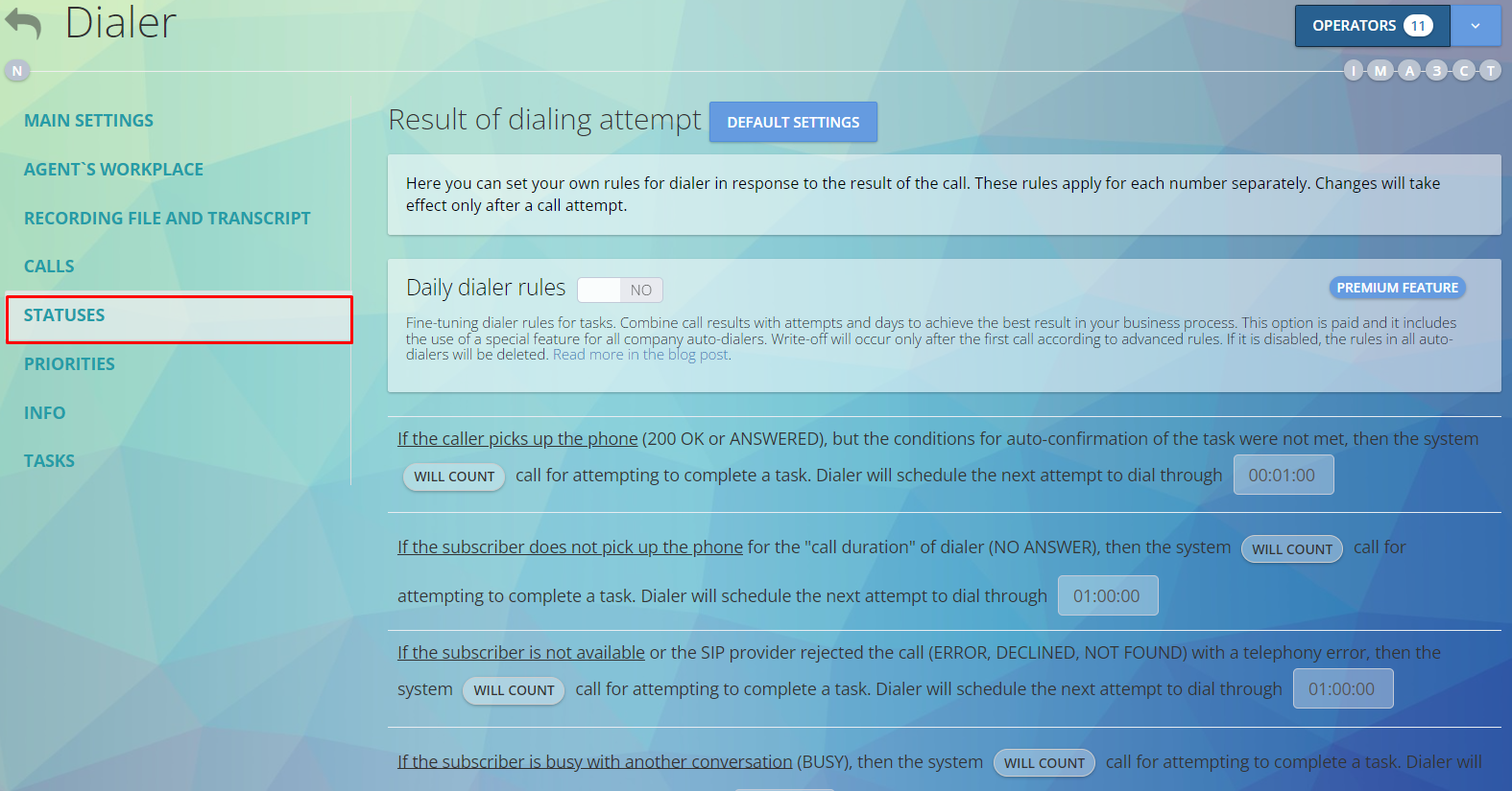 Celem zwiększenia prostoty wejścia przy pierwszym kontakcie i doświadczeniu z ustawieniem autodialera, przeanalizowaliśmy podejście do ustawień callbacków w rezultacie połączeń. Statusy z zbyt lakonicznej tabeli zmieniliśmy na interaktywne menu ustawień, dzięki czemu nowicjusz na własną rękę zrozumie, co jest czym odpowiedzialne.