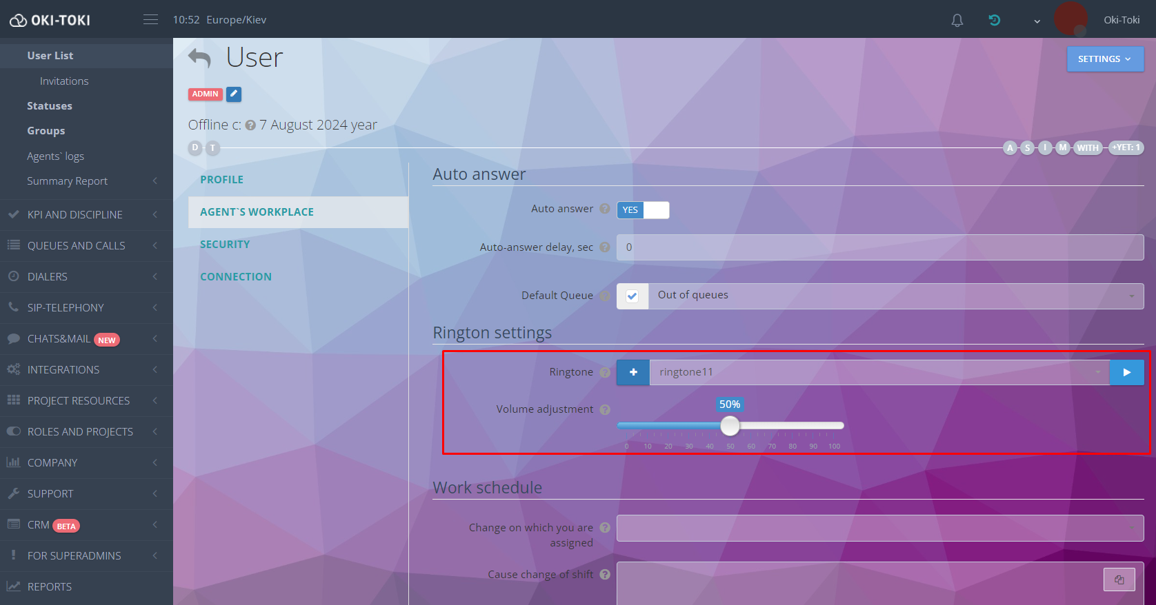Dodano możliwość pobrania niestandardowego dzwonka, który zabrzmi po otrzymaniu połączenia. Operator może pobierać dzwonki (patrz zrzut ekranu). „Operator” i „Nadzorca” mogą przesłać do 5 osobistych dzwonków, a dla użytkowników z rolą „Administrator” lub inną rolą, która ma to prawo, do 5 dodatkowych dzwonków jest dostępnych dla wszystkich pracowników w firma. Pobierz dzwonki w formacie .mp3/.wav do 3 MB.