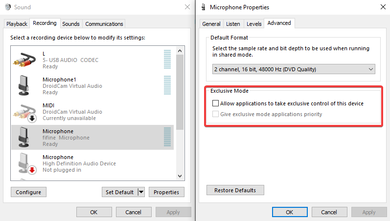 Jeżeli inna aplikacja uzyskała monopol na dostęp do mikrofonu: