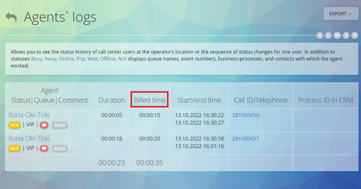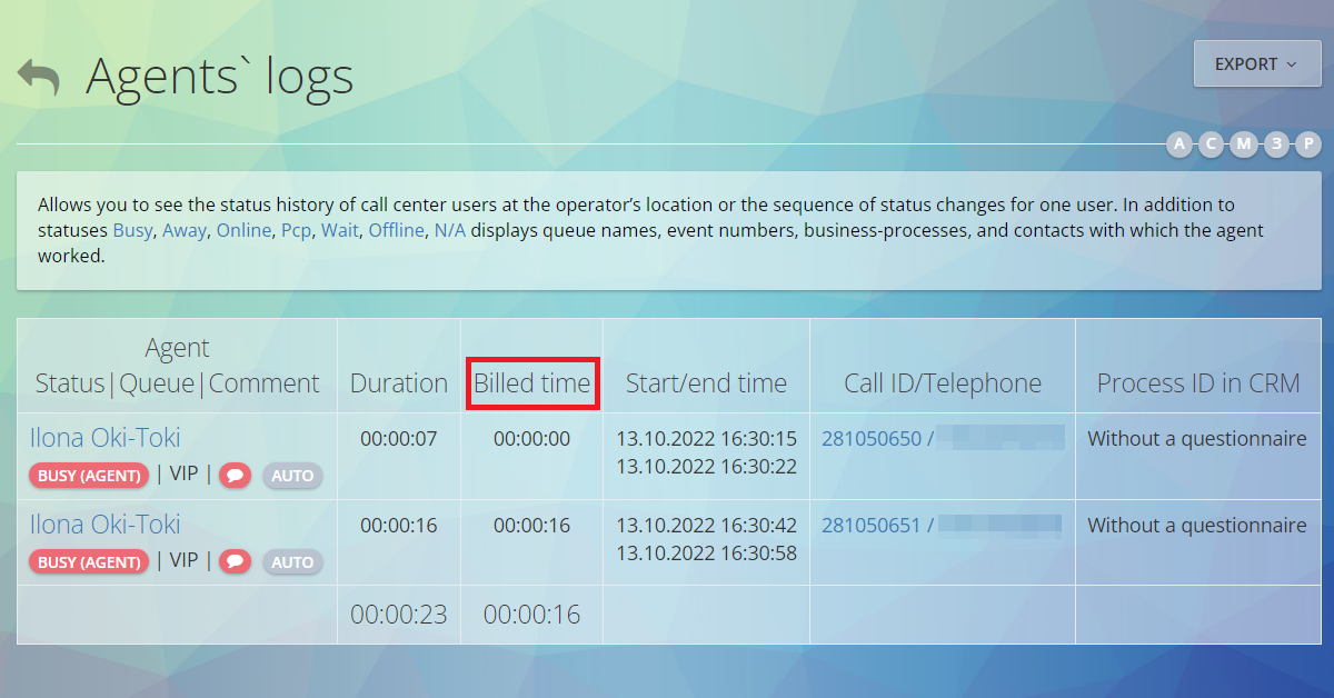 Ten narzędzie działa dla wszystkich statusów związanych z zajęciem – “Połączenie”, “Zajęty” i “PCP”.