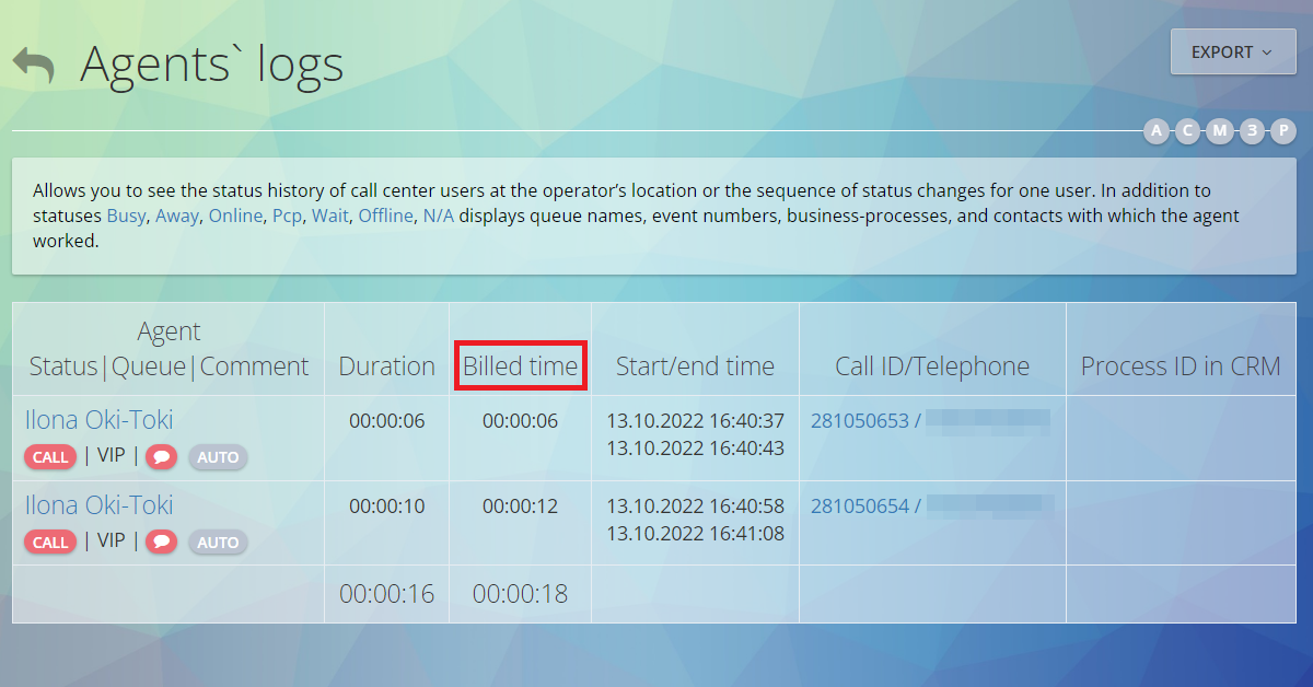 Nie będzie brane pod uwagę czas połączenia (połączenie i sygnał) dłuższe niż 30 sekund. Czyli jeżeli operator czekał na rozmowę 31 sekund – zostanie pokazane 0.