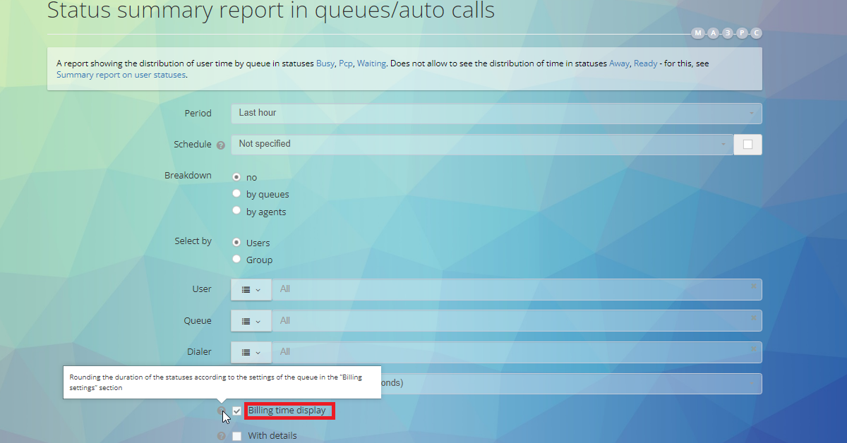 - Podczas tworzenia Raportów zbiorczych można wyświetlać dane z uwzględnieniem parametrów taryfikacji. Zbiorcze raporty z kolejek i użytkowników mogą być wykorzystywane do obliczania wynagrodzeń. Przy wyborze parametrów przy tworzeniu raportu pamiętaj, aby zaznaczyć pole „Wyświetl taryfikowany czas”.