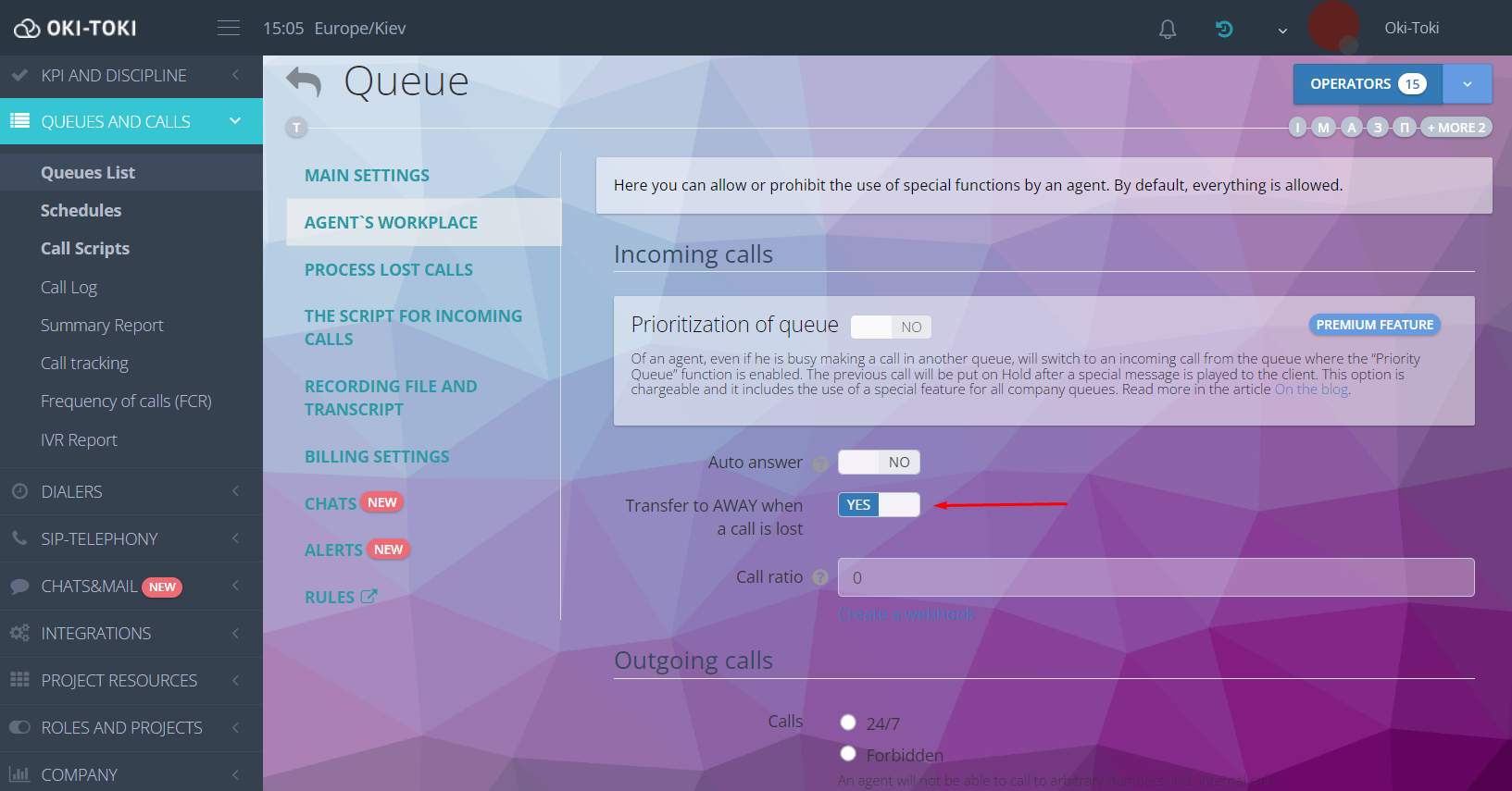 Pracując w ich CRM i gabinetach administracyjnych, operatorzy mogli nie zauważyć przychodzącego połączenia, naruszając dyscyplinę i automatycznie przełączając się na status “niebieski”, wypadając z udziału w obsłudze połączeń przychodzących i automatycznych. Dodaliśmy możliwość wyłączenia automatycznego przejścia do AWAY przy zgubionym połączeniu. Domyślnie jest włączony. Można go wyłączyć tutaj (zasadnicze ekrany poniżej).